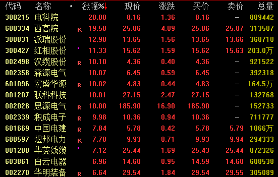 特高压概念盘中发力走高,截至收盘,电科院20%涨停,西高院逼近20%涨停,红相股份涨超11%,思源电气亦涨停。