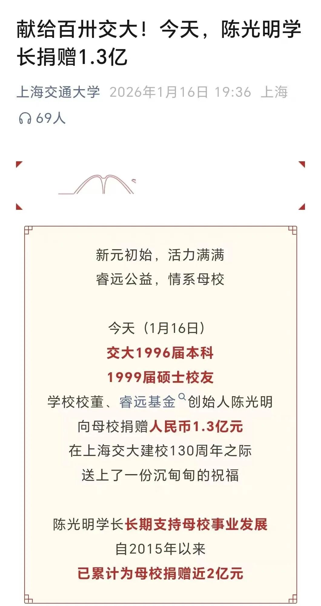 【导读】陈光明向上海交大捐赠1.3亿元,覆盖医疗帮扶、科研创新等领域