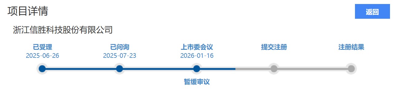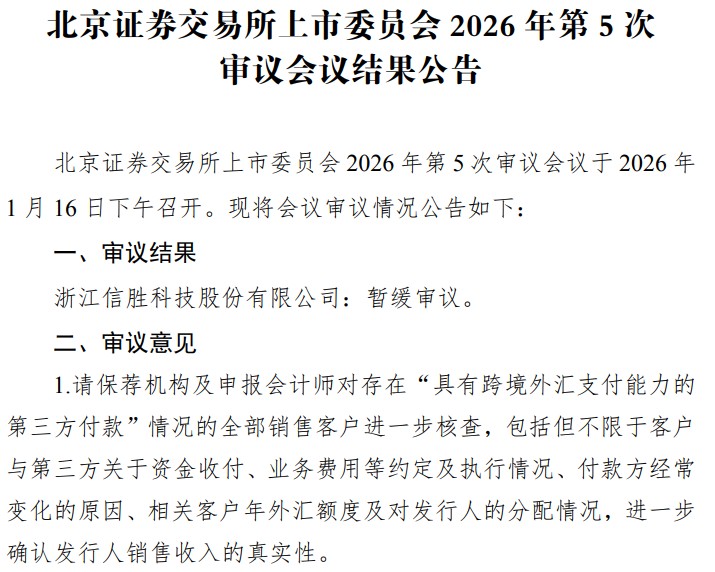 1月16日,“上会”迎考的浙江信胜科技股份有限公司(以下简称信胜科技)遭遇了小概率事件:据北交所官网,北交所上市委员会2026年第5次审议会议结果公告显示,该所上市委员会2026年第5次审议会议于2026年1月16日下午召开,会议审议结果为:信胜科技暂缓审议。