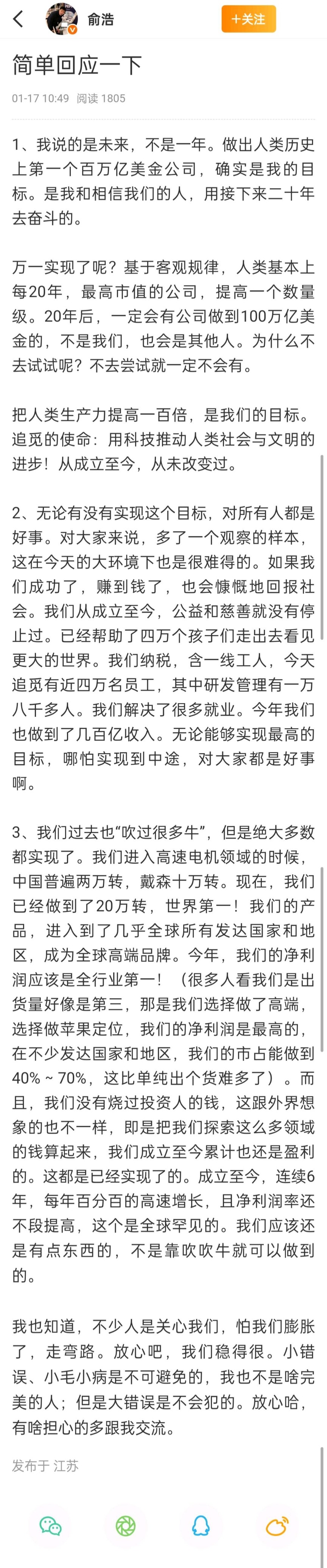 1月17日上午,针对此前朋友圈言论,俞浩再次通过社交媒体进行回应。他表示,这一目标是未来目标,并非短期内实现。