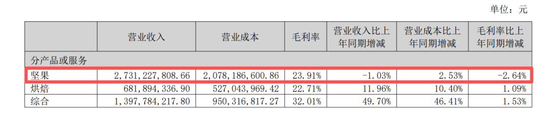 作为核心业务的坚果品类,2025 年上半年实现营收27.31亿元,占总收入约50%,但毛利率同比下降2.64个百分点至23.91%,成本压力已有所显现。