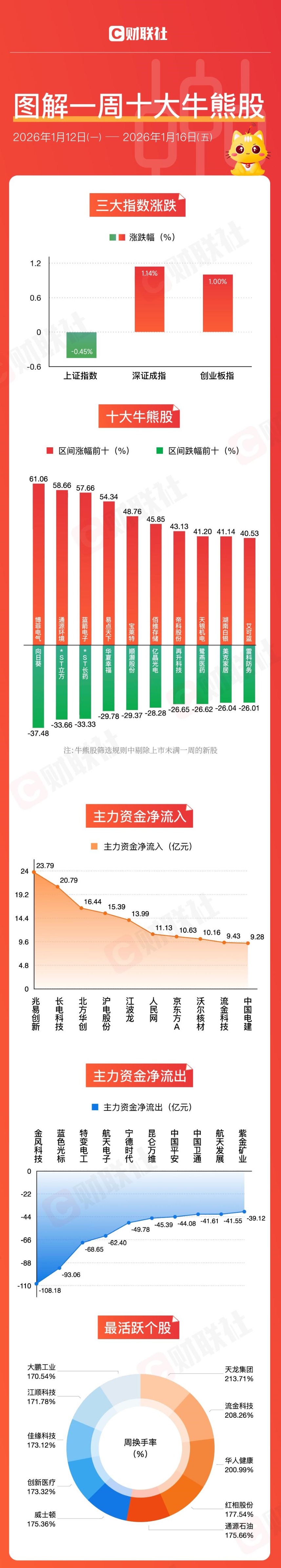 本周A股三大指数涨跌不一,其中上证指数周跌0.45%,深成指周涨1.14%,创业板指周涨1.00%,市场交易量放量明显,其中1月14日两市成交额逼近4万亿。本周贵金属、半导体、电网设备板块涨幅居前,AI应用、存储芯片概念股表现活跃。