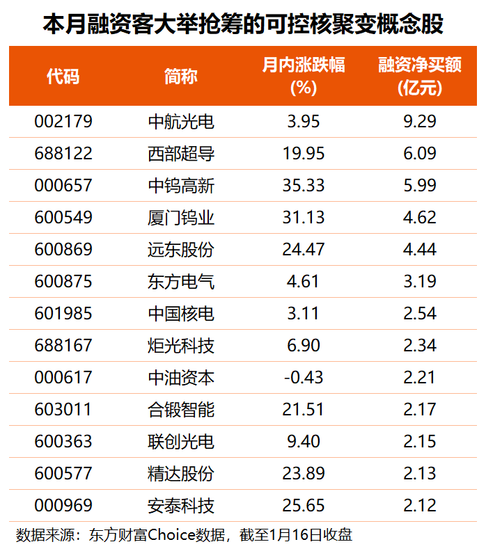 资金层面,今年以来,共有53只可控核聚变概念股获得融资净买入,净买额超1亿元的个股多达22只。其中,中航光电获融资客大举抢筹9.29亿元,西部超导、中钨高新分别获融资净买入6.09亿和5.99亿元,厦门钨业、远东股份、东方电气融资净买额均在3亿元以上。