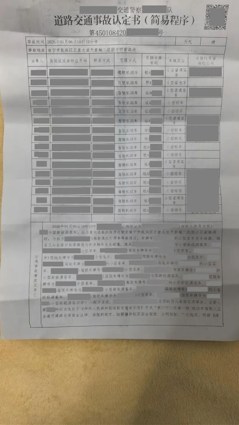 南都此前报道,有网友在社交平台发布视频称,南宁一辆阿维塔以超100km/h车速连撞十几台车。南都记者获悉,事故发生于1月6日。