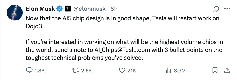 1月19日,马斯克在社交媒体X上发文称,“当下AI5芯片的设计已经基本完成,特斯拉将重启Dojo3的研发工作。”