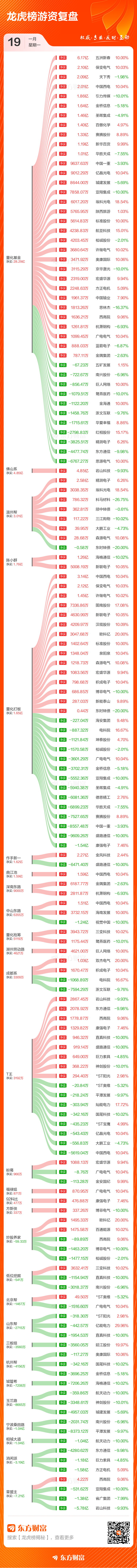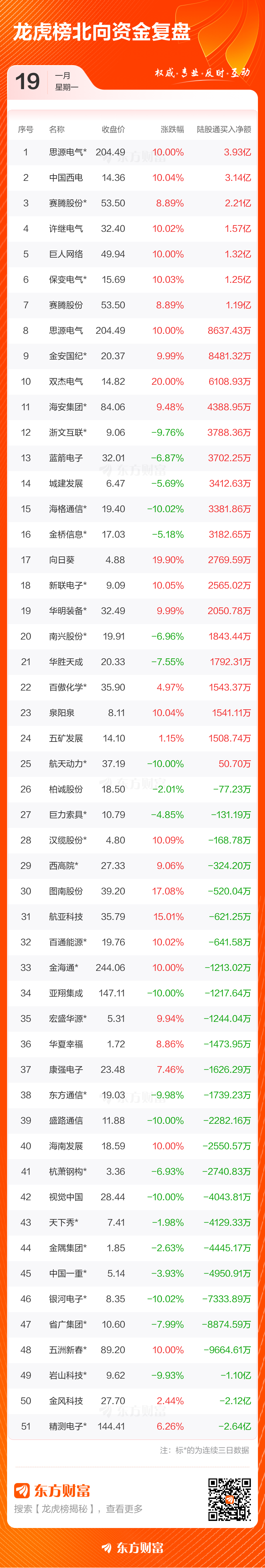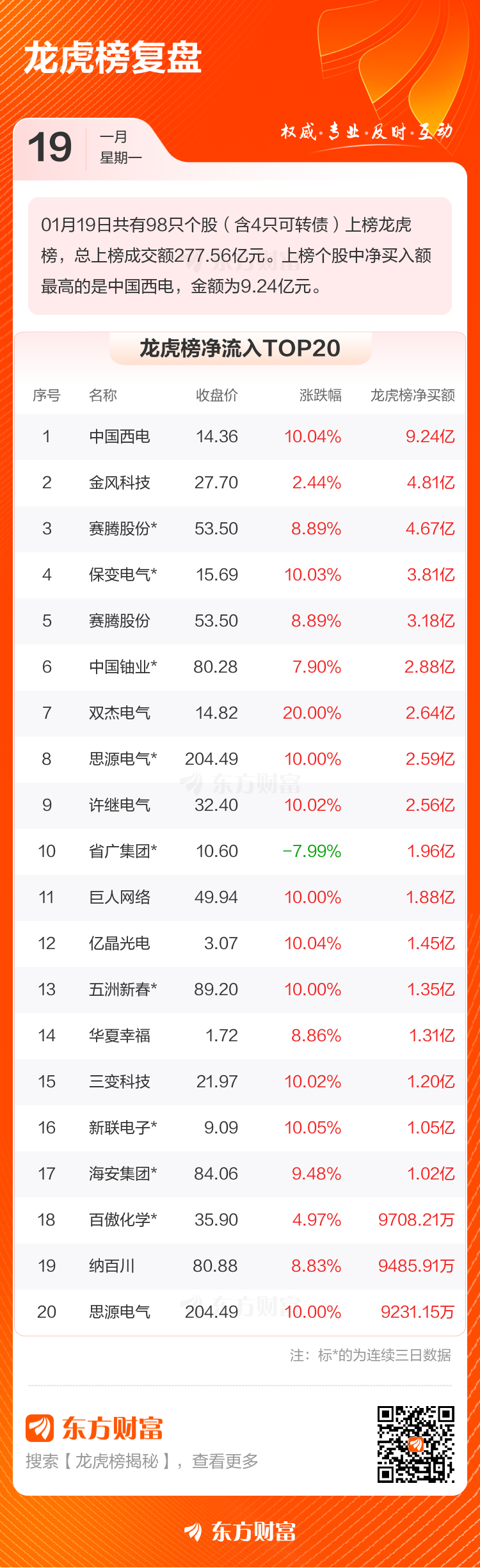 1月19日共有98只个股(含4只可转债)上榜龙虎榜,总上榜成交额277.56亿元。上榜个股中净买入额最高的是中国西电,金额为9.24亿元。