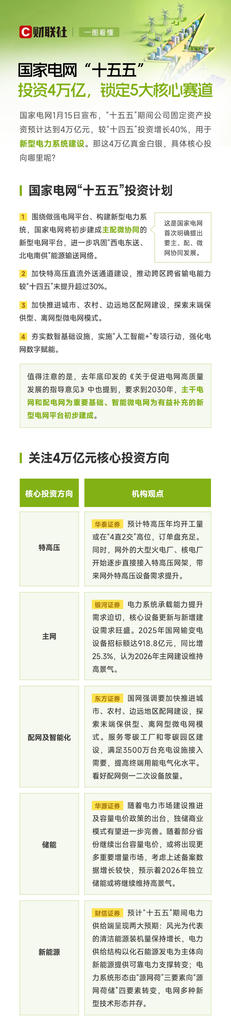 ①国家电网宣布“十五五”期间预计投资4万亿元,较“十四五”投资增长40%,用于新型电力系统建设。②核心投资方向包括特高压、主网、配网及智能化、储能和新能源,各机构看好相关领域的发展前景。