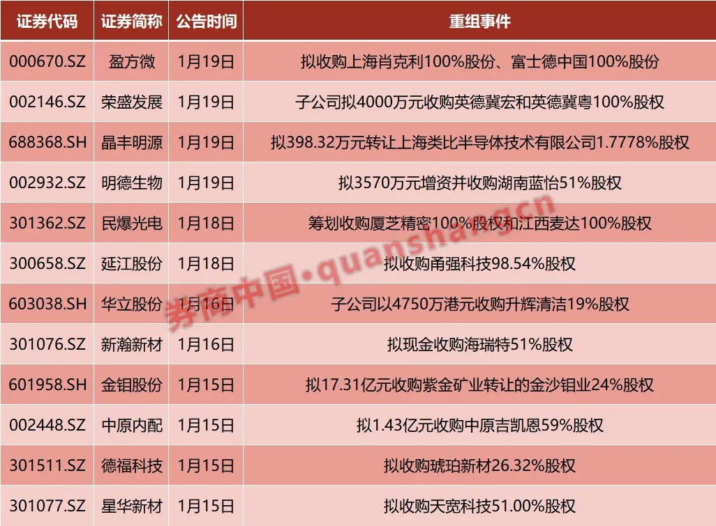 2026年以来,A股并购重组市场持续活跃,据不完全统计,1月15日以来,包括盈方微、荣盛发展、晶丰明源、明德生物、延江股份、民爆光电、新瀚新材、华立股份、星华新材、德福科技、中原内配、金钼股份的12家A股上市公司披露了并购重组进展最新公告。