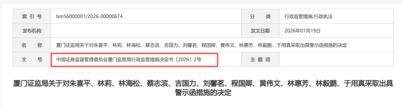 厦门证监局最新开出三张监管文书,北交所上市公司路桥信息因财务造假领厦门证监局2026年1号、2号罚单,公司及8名直接责任人合计被罚2150万元,另有11名时任董监高一同被追责。