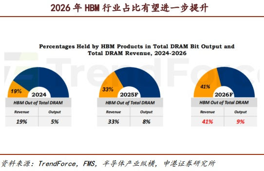 2025年HBM出货及销售额占DRAM的比例提升明显,出货量从2024年的5%提升至8%、销售额占比从19%提升至33%。2026年,HBM出货及销售额占比有望进一步提升,分别至9%和41%。