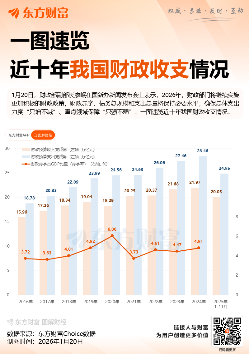 1月20日,财政部副部长廖岷在国新办新闻发布会上表示,2026年财政赤字、债务总规模和支出总量将保持必要水平,确保总体支出力度只增不减、重点领域的保障只强不弱,“要着重强调的是在2025年更加积极的基础上,继续扩大财政支出盘子,本身就体现了政策是十分积极的。”