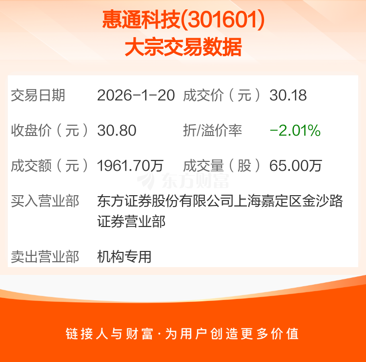 2026年1月20日,惠通科技发生1笔大宗交易,共成交65.00万股,成交金额1961.70万元,占其流通市值比例为0.75%。