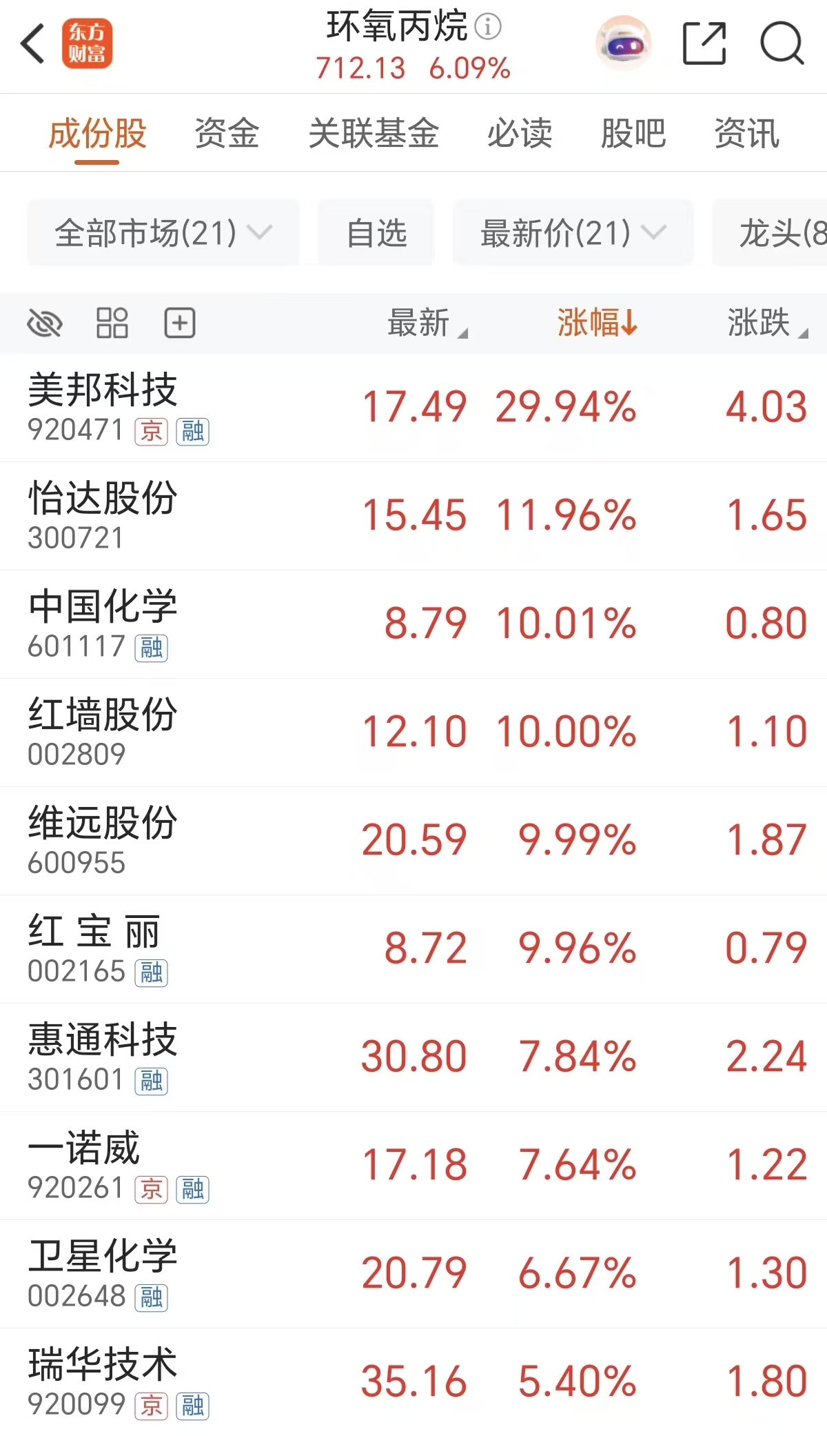 涨价主题是A股备受资金关注的主线之一。周二环氧丙烷概念走高,收盘逆势大涨超6%,美邦科技30CM涨停,中国化学、红墙股份、红宝丽等多股涨停。