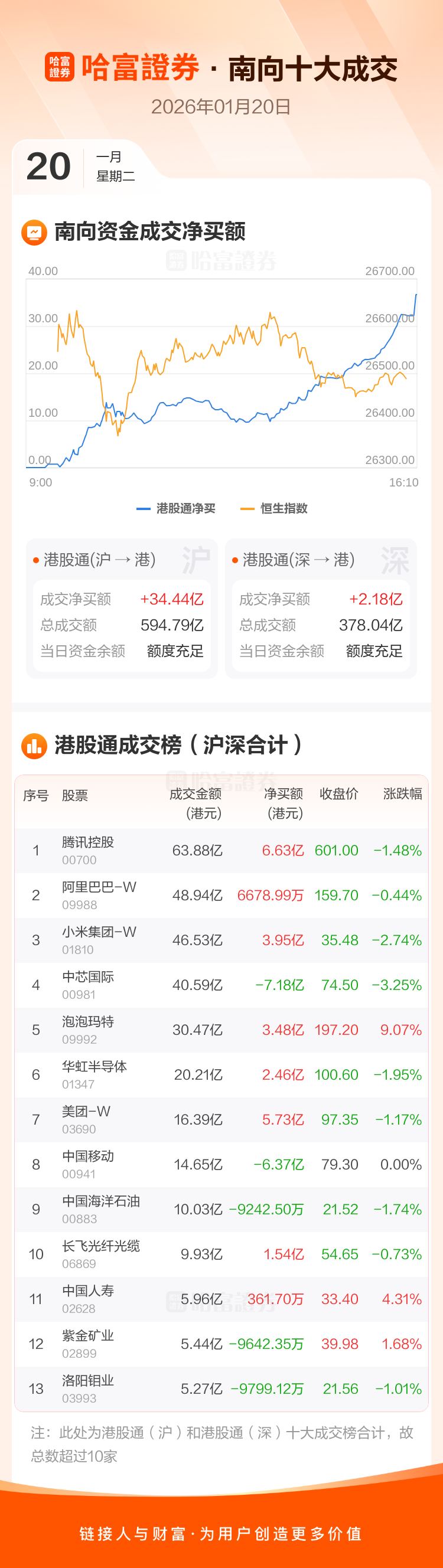 恒生指数1月20日跌0.29%,收报26487.51点。南向资金今日净买入港股36.63亿港元。南向资金今日成交额972.83亿港元,港股大市成交2377.66亿港元。
