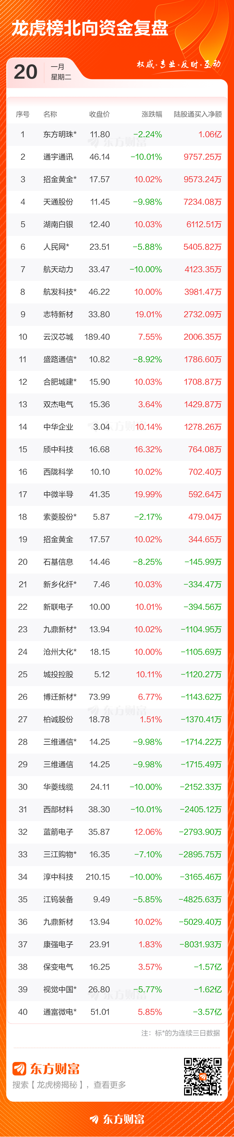 1月20日共有78只个股(含1只可转债)上榜龙虎榜,总上榜成交额195.20亿元。上榜个股中净买入额最高的是航发科技,金额为3.33亿元。