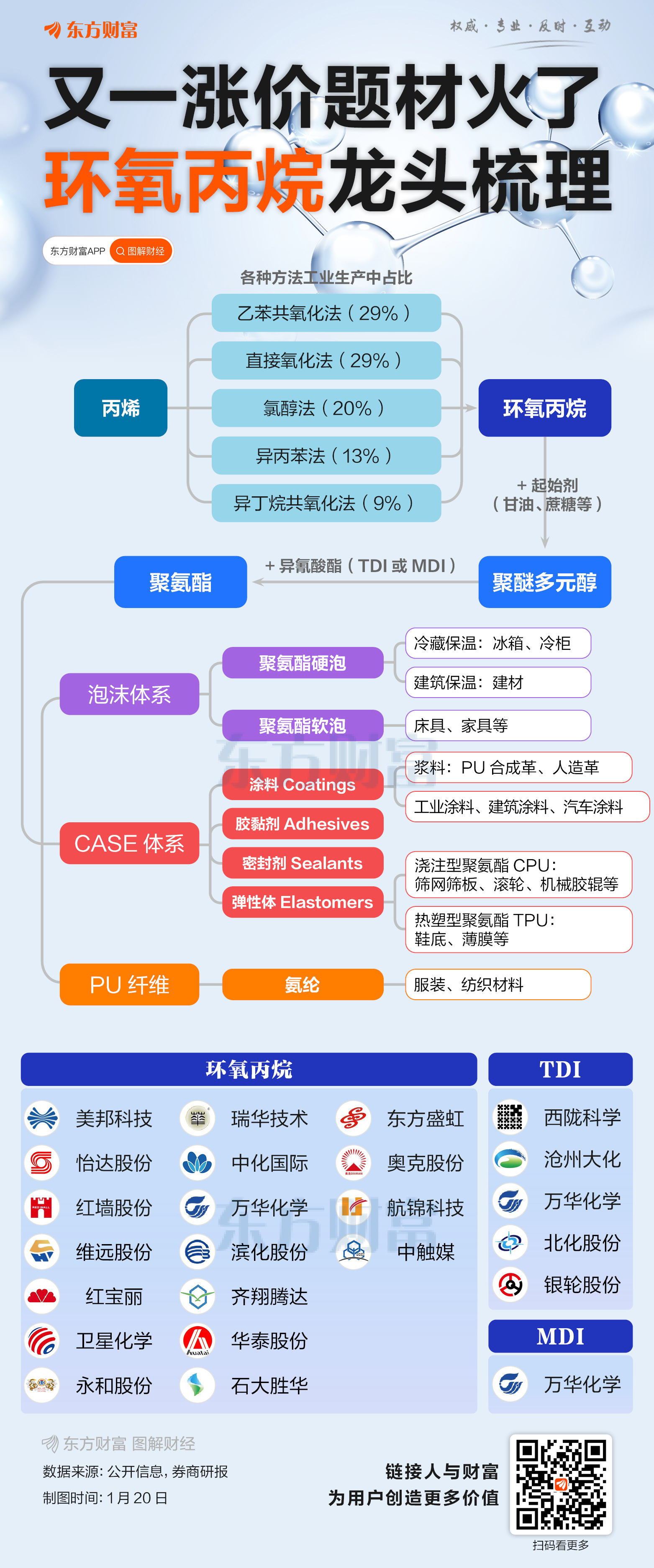 继双季戊四醇、六氟磷酸锂之后,A股又有化学品遭到了追捧。1月20日,环氧丙烷、TDI两个概念板块表现强势,环氧丙烷概念中美邦科技、红墙股份、维远股份、红宝丽涨停,TDI概念中西陇科学、沧州大化涨停。