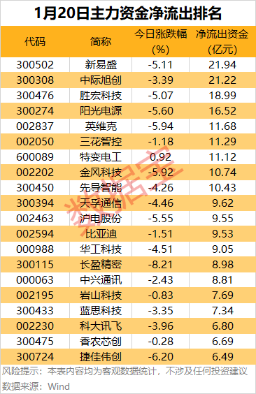据数据宝统计,今日有108股主力资金净流出均超2亿元,其中新易盛、中际旭创、胜宏科技、阳光电源、英维克、三花智控等9股净流出金额均超10亿元。