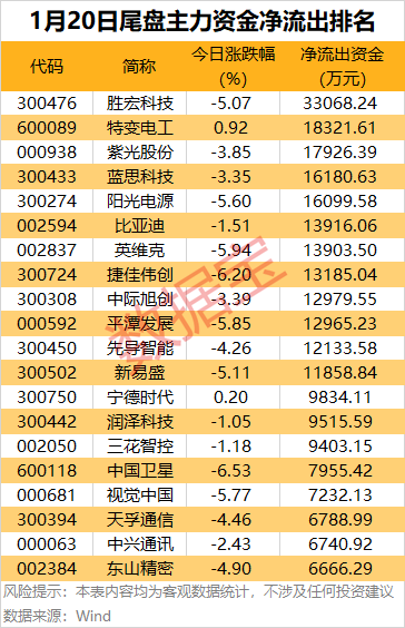 尾盘主力资金净流出方面,胜宏科技尾盘主力资金净流出金额超3亿元;特变电工、紫光股份、蓝思科技、阳光电源、比亚迪等尾盘主力资金净流出金额均超1亿元。