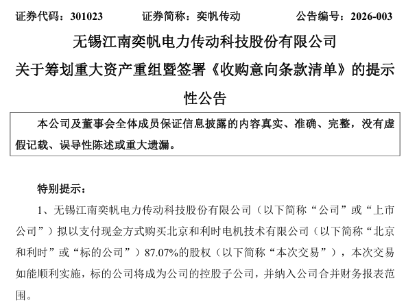 奕帆传动(301023)1月20日晚间公告,公司拟以支付现金方式购买北京和利时电机技术有限公司(简称“北京和利时”)87.07%的股权,本次交易如能顺利实施,北京和利时将成为公司的控股子公司,并纳入公司合并财务报表范围。