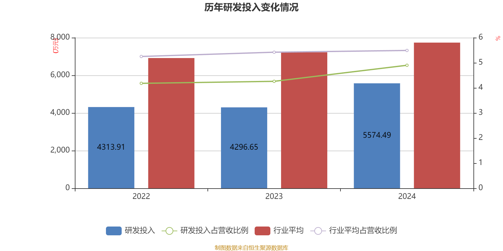 2024年全年,公司研发投入金额为5574.49万元,同比增长29.74%;研发投入占营业收入比例为4.9%,相比上年同期上升0.64个百分点。此外,公司全年研发投入资本化率为0。