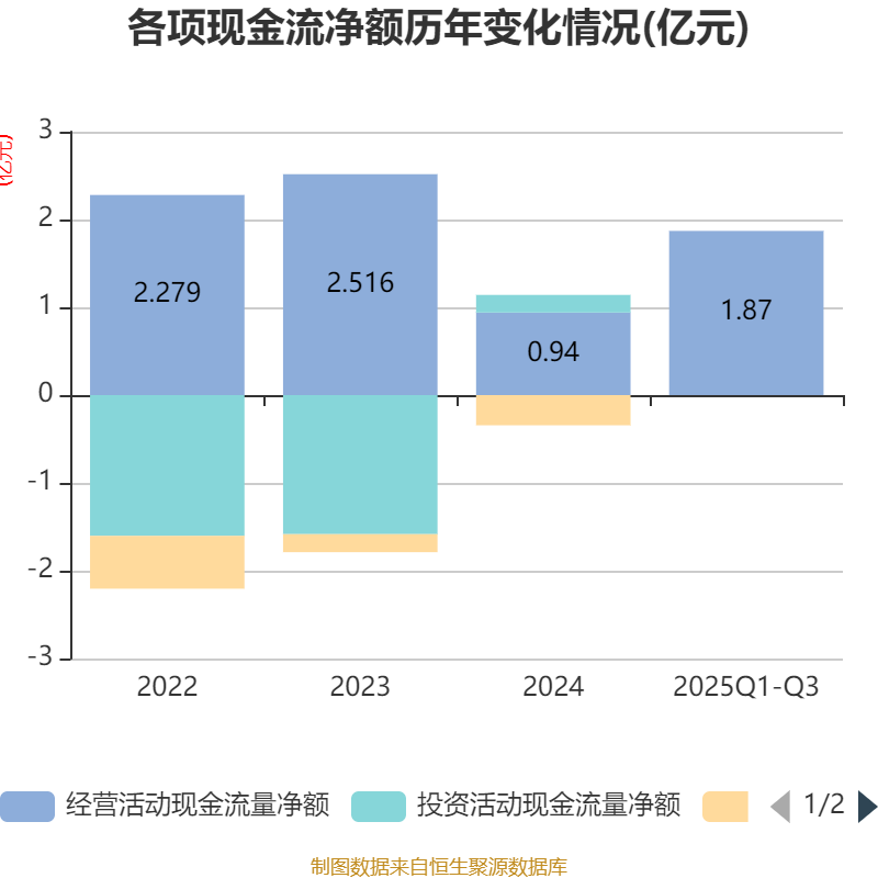 2025年前三季度,公司经营活动现金流净额为1.87亿元,同比增长100.56%;筹资活动现金流净额0元,与同期相比基本不变;投资活动现金流净额0元,上年同期为0元。
