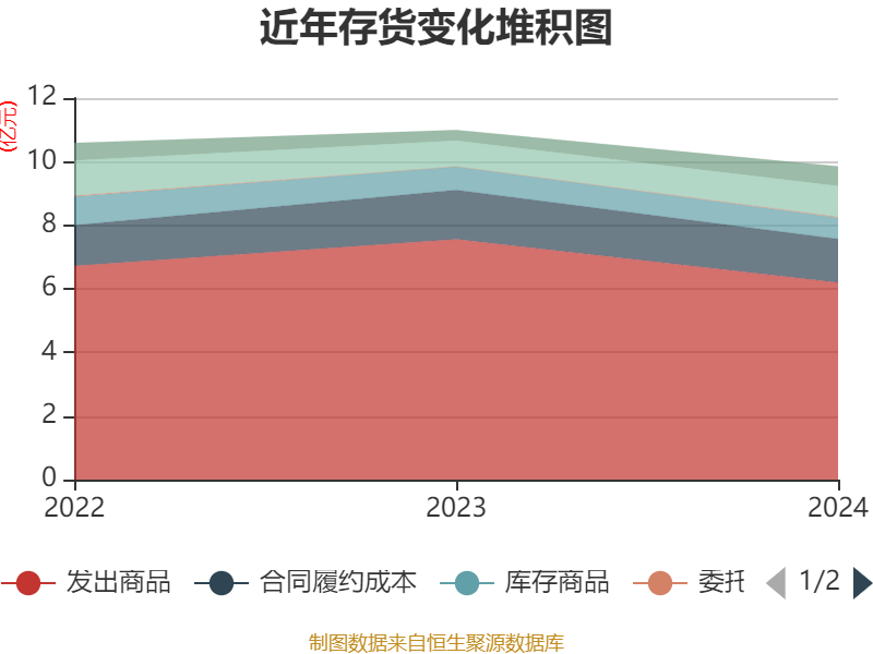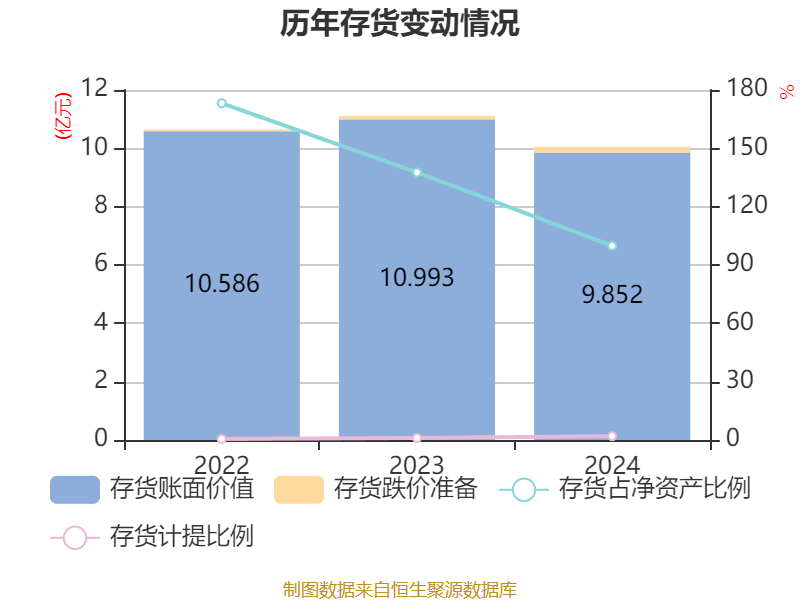 从存货变动来看,截至2024年末,公司存货账面价值为9.85亿元,占净资产的99.88%,较上年末减少1.14亿元。其中,存货跌价准备为1950.87万元,计提比例为1.94%。