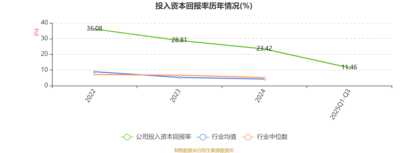 公司2024年投入资本回报率为23.42%,较上年同期下降5.39个百分点。2025年前三季度投入资本回报率为11.46%,较上年同期下降35.66个百分点。