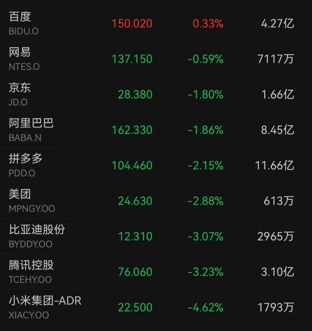 中概股方面,纳斯达克中国金龙指数下跌1.45%。中概互联概念股近乎均收跌。百度上涨0.33%;小米集团下跌4.62%,腾讯控股、美团、拼多多分别下跌3.23%、2.88%、2.15%。