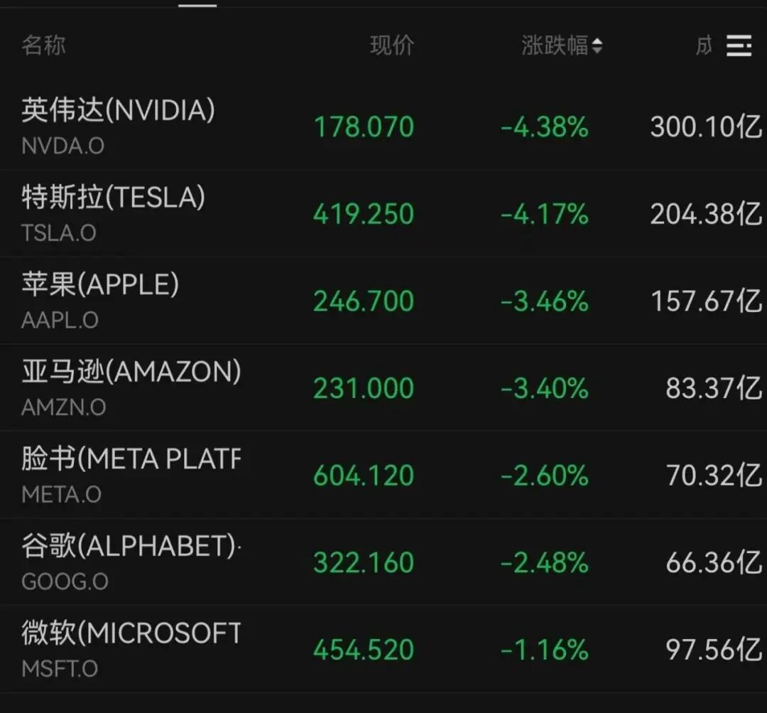 美股科技股集体下挫,英伟达、特斯拉分别下跌4.38%、4.17%,苹果、亚马逊、脸书等科技巨头全部收跌。