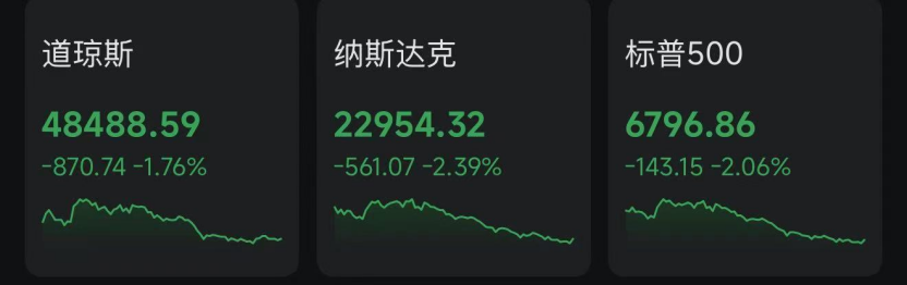 当地时间1月20日,美股三大指数收跌。截至收盘,道指跌870.74点,跌幅1.76%,报48488.59点;纳指跌561.07点,跌幅2.39%,报22954.32点;标普500指数跌143.15点,跌幅2.06%,报6796.86点。