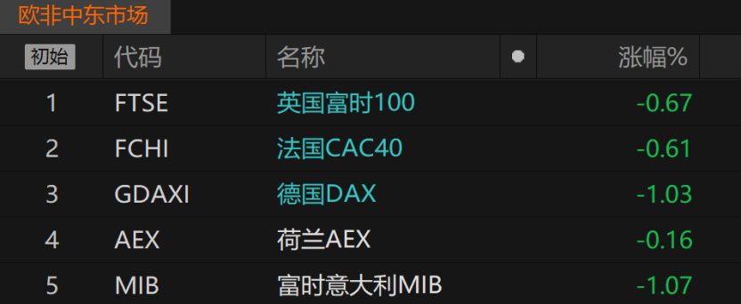 欧洲主要股指亦大跌。截至收盘,英国富时100指数、法国CAC40指数分别下跌0.67%、0.61%,德国DAX指数、意大利MIB指数均跌超1%。