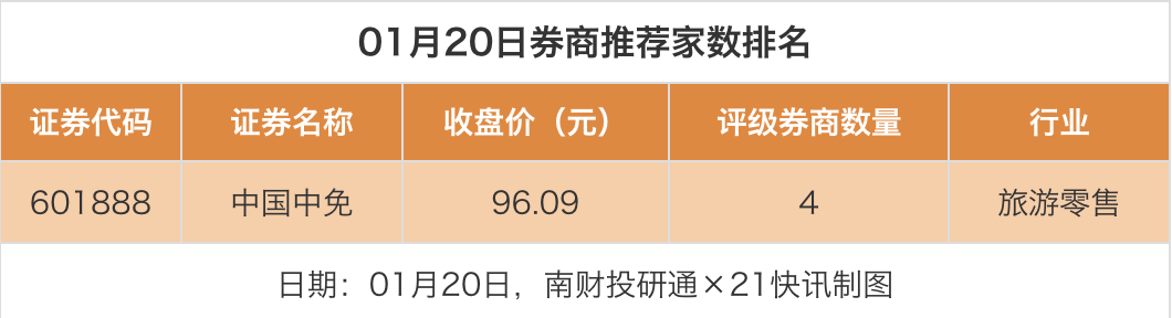 从券商推荐家数来看,1月20日有17家上市公司得到券商推荐,其中中国中免获得4家推荐,南山铝业、佛燃能源等获得1家推荐。