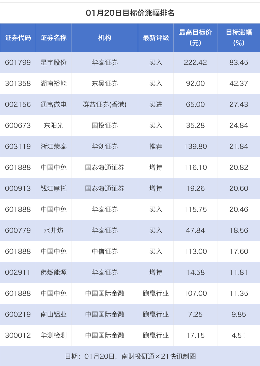 南财投研通数据显示,1月20日,券商给予上市公司目标价共14次,按最新收盘价计算,目标价涨幅排名居前的公司有星宇股份、湖南裕能、通富微电,目标价涨幅分别为83.45%、42.37%、27.43%,分别属于汽车零部件、电池、半导体行业。