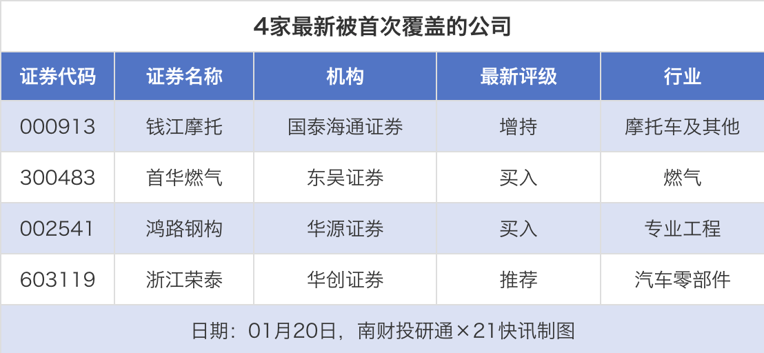 首次覆盖方面,1月20日券商共给出了4次首次覆盖,其中钱江摩托获得国泰海通证券给予“增持”评级,首华燃气获得东吴证券给予“买入”评级,鸿路钢构获得华源证券给予“买入”评级,浙江荣泰获得华创证券给予“推荐”评级。
