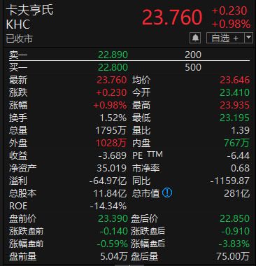 卡夫亨氏股价周二收盘上涨23美分,报23.76美元,伯克希尔持有的股份价值约77亿美元。在提交招股说明书补充文件后,该股在盘后交易中下跌超3%。