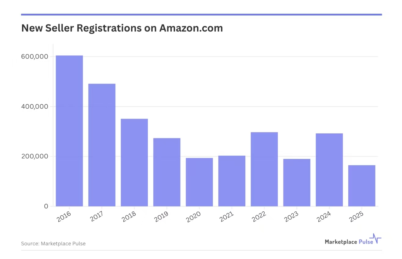 亚马逊2025年卖家注册量锐减。近日,知名跨电商研究机构Marketplace Pulse发布的报告显示,2025年,亚马逊全球新增卖家数量跌至16.5万,同比大幅下降44%。这也是该机构自2015年开始统计以来的最低记录。
