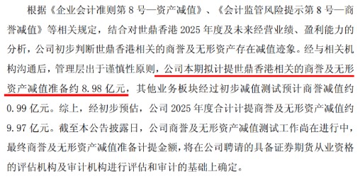 更为致命的是,基于对世鼎香港未来盈利能力的预判,公司拟计提相关商誉及无形资产减值准备约8.98亿元,叠加其他业务板块0.99亿元的商誉减值,2025年合计减值金额高达9.97亿元,成为吞噬利润的主要推手。