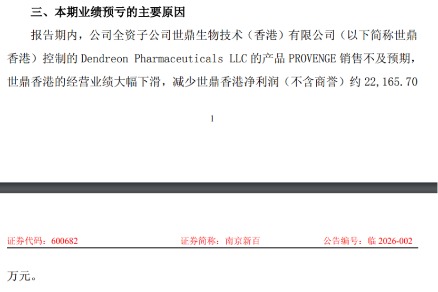 南京新百在公告中明确,全资子公司世鼎生物技术(香港)有限公司(以下简称“世鼎香港”)控制的Dendreon Pharmaceuticals LLC(以下简称“丹瑞”)产品PROVENGE销售不及预期,导致世鼎香港经营业绩大幅下滑,减少世鼎香港净利润(不含商誉)约2.22亿元。