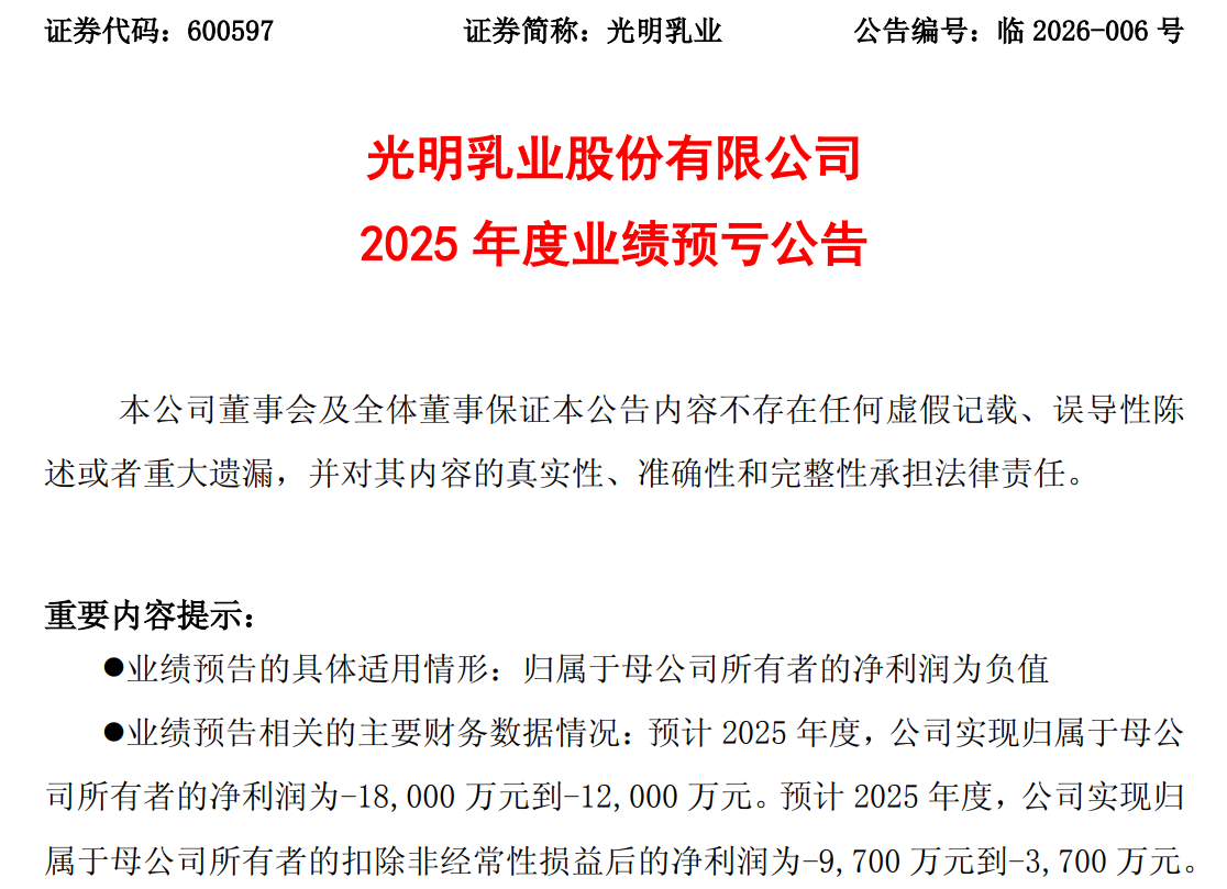 1月20日晚间,光明乳业(600597)披露2025年度业绩预亏公告,预计2025年实现归属于母公司所有者的净利润亏损1.2亿元—1.8亿元,预计2025年实现归属于母公司所有者的扣除非经常性损益后的净利润亏损3700万元至9700万元。
