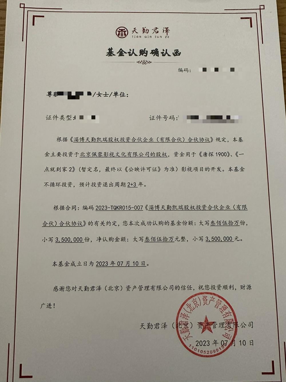 天勤君泽基金认购确认函。(受访者供图)