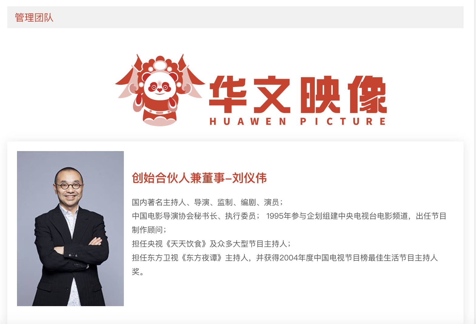 华文映像官网仍显示,刘仪伟为创始合伙人兼董事。(图片来源:网站截图)