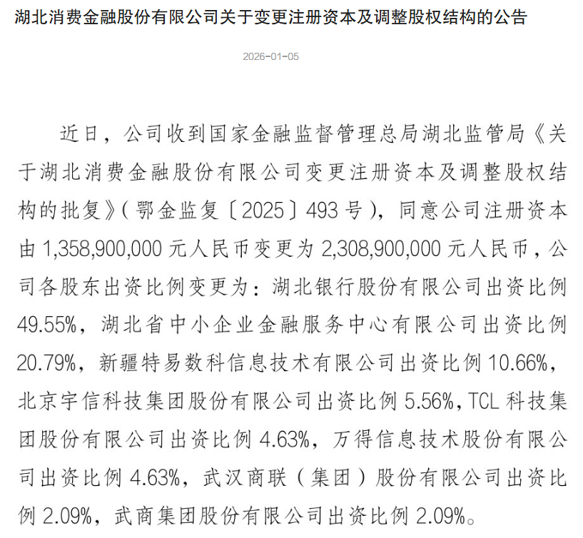 1月5日,湖北消费金融股份有限公司发布关于变更注册资本及调整股权结构的公告。国家金融监督管理总局湖北监管局批复,同意湖北消费金融股份有限公司的注册资本由13.589亿元变更为23.089亿元。