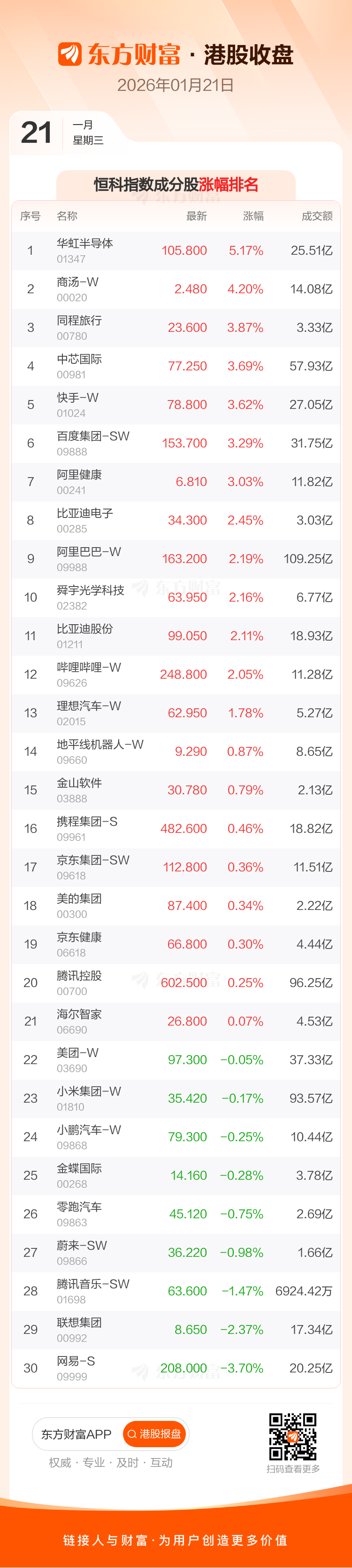港股1月21日收盘走高,恒生指数收报26585.06点,涨97.55点,涨幅0.37%;恒生科技指数收报5746.3点,涨62.86点,涨幅1.11%。恒生指数成分股中中芯国际、快手-W、药明生物涨幅居前,安踏体育、网易-S、申洲国际跌幅靠前。恒生科技指数成分股中华虹半导体、商汤-W、同程旅行涨幅居前,网易-S、联想集团、腾讯音乐-SW跌幅靠前。