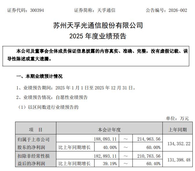 1月21日,天孚通信(300394.SZ)发布2025年度业绩预告,预计归属于上市公司股东的净利润为18.81亿元-21.50亿元,比上年同期增长40.00%-60.00%。主要得益于人工智能行业加速发展与全球数据中心建设,带动了高速光器件产品需求的持续稳定增长,叠加公司智能制造持续降本增效,共同促进了公司有源和无源产品线营收增长。另一方面,报告期内受汇兑损失影响,财务费用同比上升,对本期业绩增长产生一定负向影响。