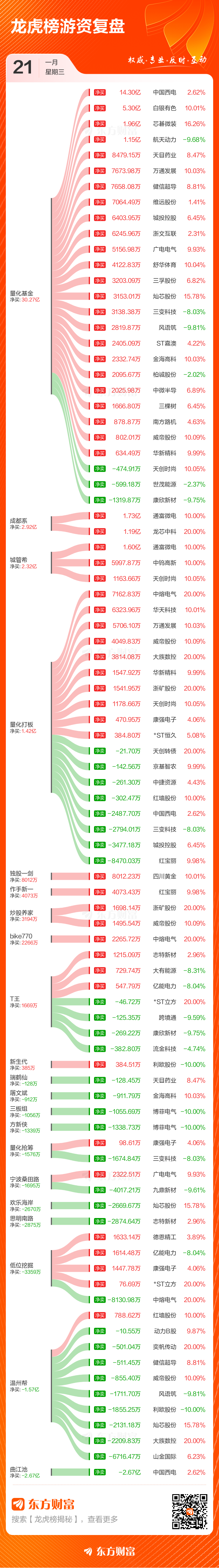 1月21日共有73只个股(含1只可转债)上榜龙虎榜,总上榜成交额212.13亿元。上榜个股中净买入额最高的是中国西电,金额为10.45亿元。