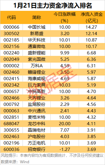 新易盛、华天科技、通富微电主力资金净流入分别为12.14亿元、10.87亿元、10.17亿元。
