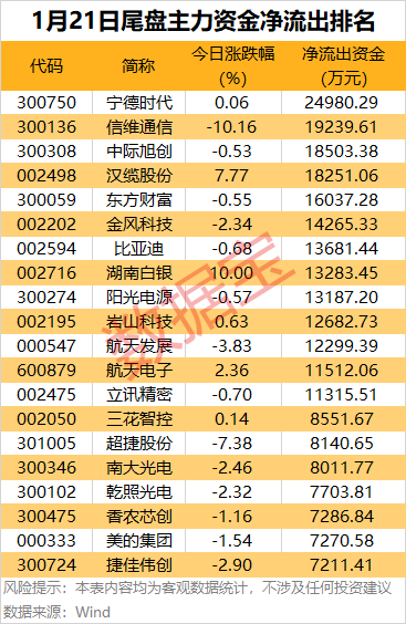 尾盘主力资金净流出方面,宁德时代尾盘主力资金净流出金额超2亿元,居首;信维通信、中际旭创、汉缆股份、东方财富等尾盘主力资金净流出金额均超1亿元。