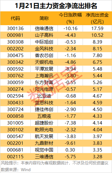 据数据宝统计,今日有42股主力资金净流出均超2亿元,其中信维通信、山子高科、中际旭创、金风科技、香农芯创、天银机电、平潭发展、上海瀚讯等净流出金额居前。