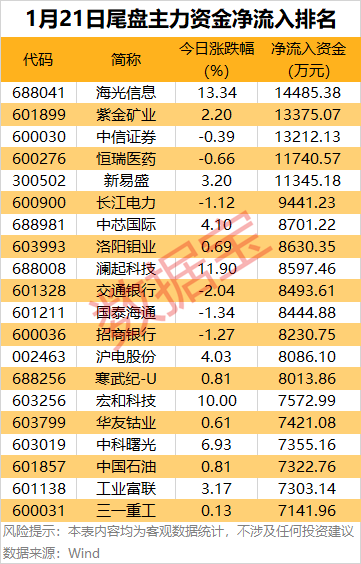 个股方面,海光信息、紫金矿业、中信证券、恒瑞医药、新易盛尾盘主力资金大幅净流入均超1亿元。