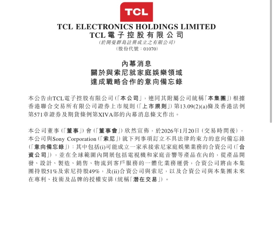 2026年1月20日,TCL电子和索尼公司发布公告称,双方签署了意向备忘录,在电视等家庭娱乐领域达成战略合作。